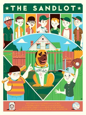 If you’re looking for a more cartoonish approach to this sports treasure, then you might like Dave Perillo’s tribute to The Sandlot in the form of these two prints. He incorporates some baseball imagery by including the baseball diamond surrounding the dog named Hercules, not to mention a kind of baseball card frame around the entire print and a starting line-up kind of assembly of the kids at the top. There’s even a s’more in the lower left hand corner for good measure.